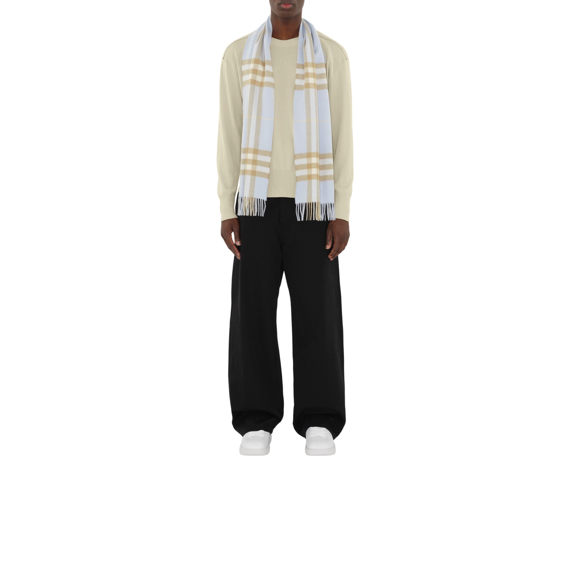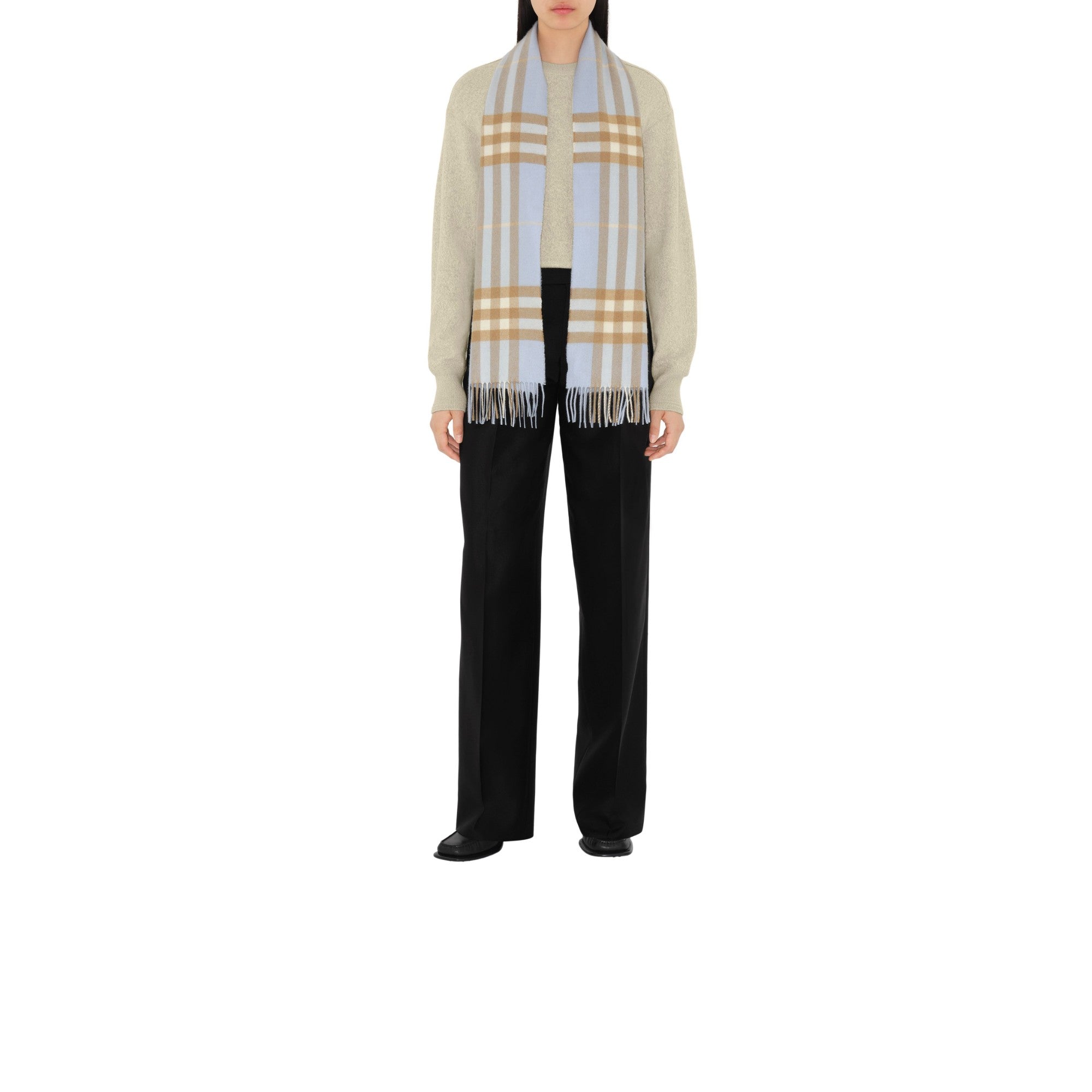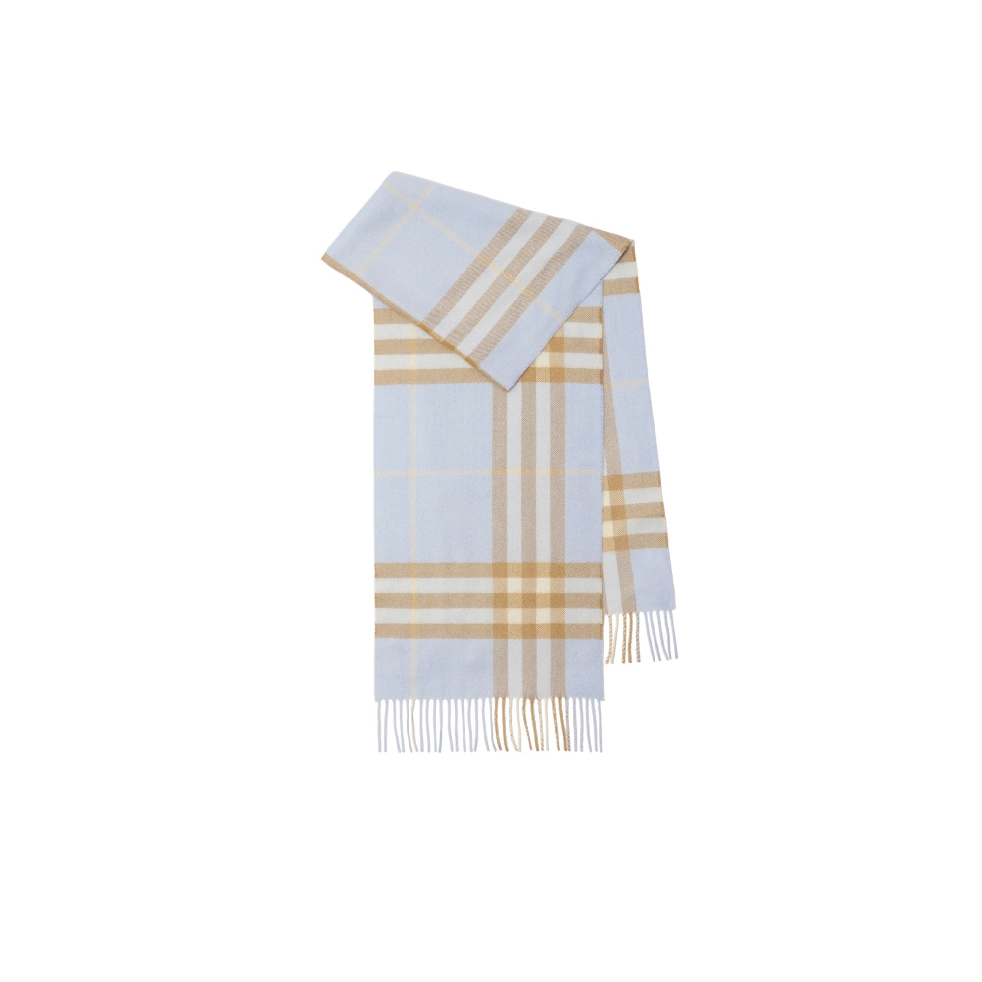 1797년 설립된 스코틀랜드 직물 공장에서 제작된 아이코닉 버버리 체크 캐시미어 스카프. 전통 베틀을 사용해 최소 30개의 단계를 거쳐 완성되는 아이템. 현지의 천연수로 세척한 후, 말린 티젤 꽃을 사용해 원단 표면을 브러싱 처리하여 캐시미어 특유의 자연스러운 광택과 매우 부드럽고 풍성한 촉감이 특징.##직사각형#양 가장자리의 프린지 디테일