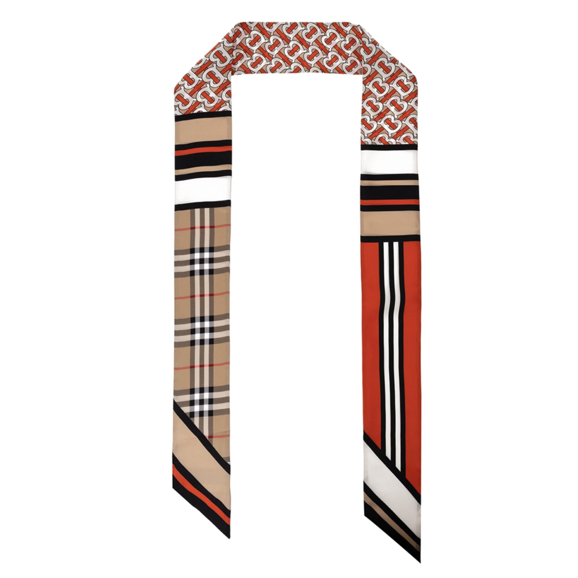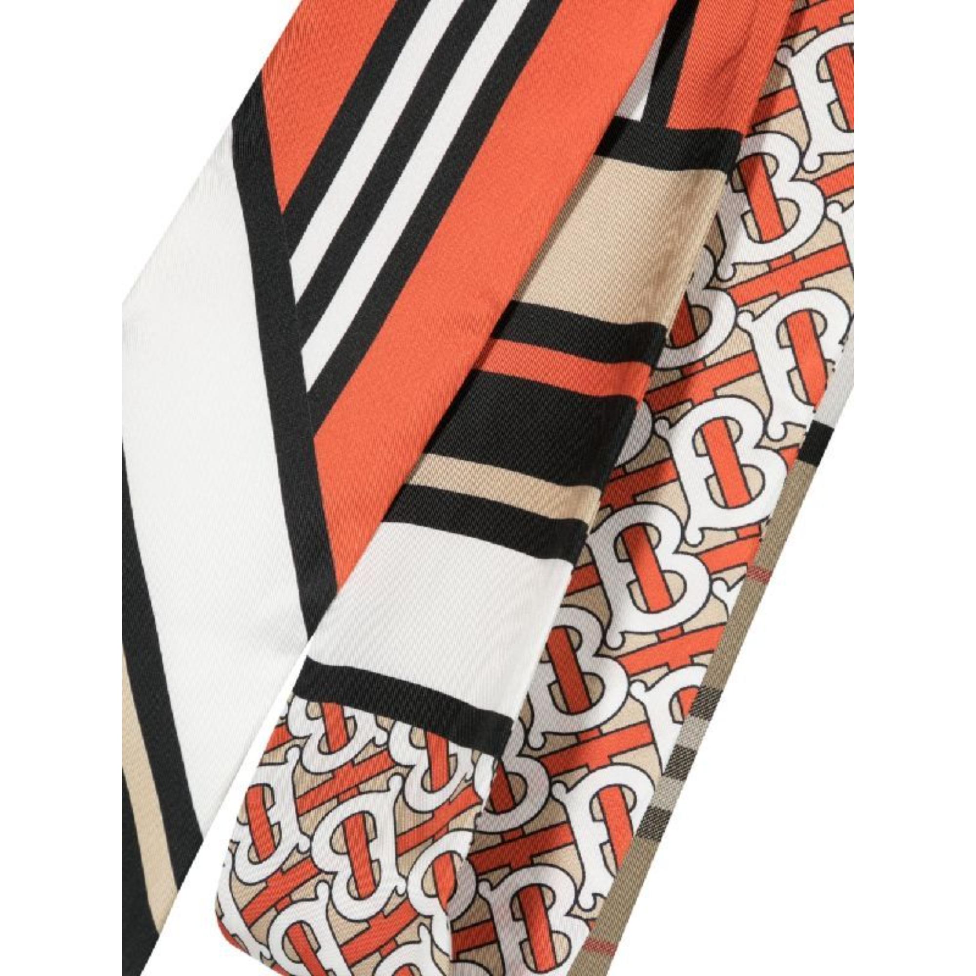 이탈리아에서 제작된 실크 트윌 소재의 스키니 스카프. 토마스 버버리 모노그램, 버버리 체크 및 아이콘 스트라이프 프린트가 특징.