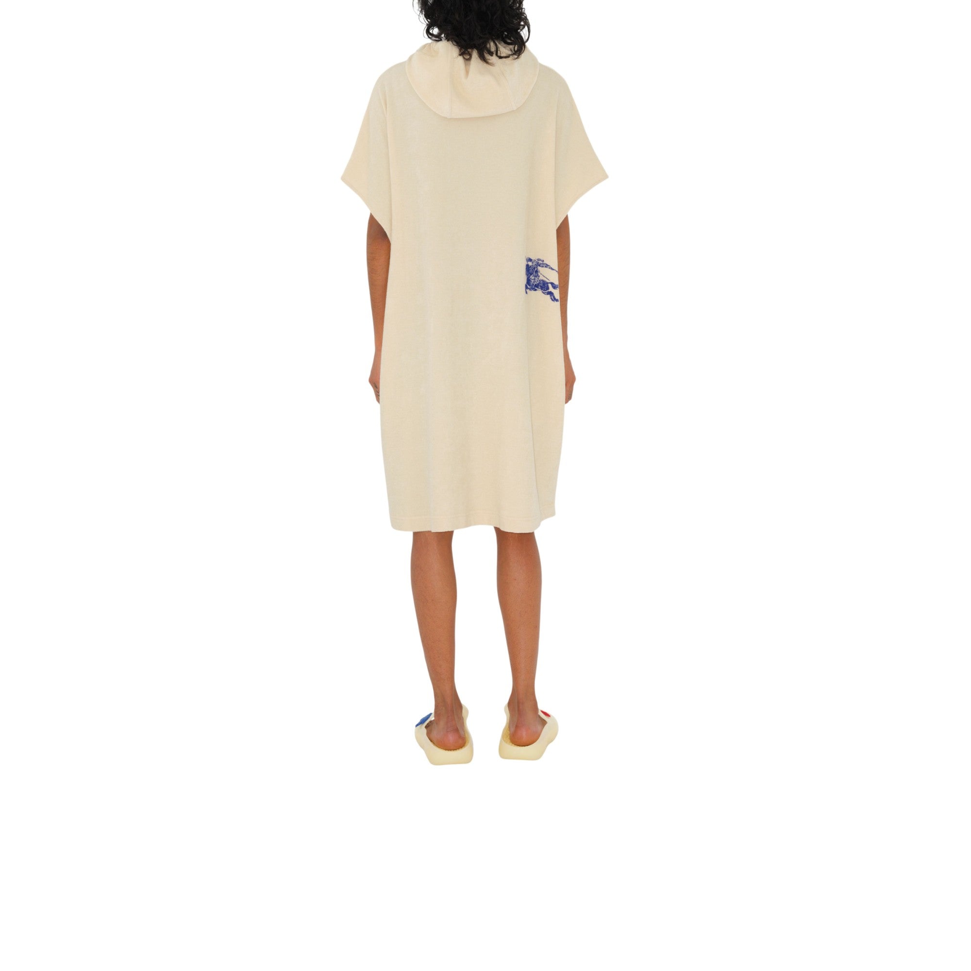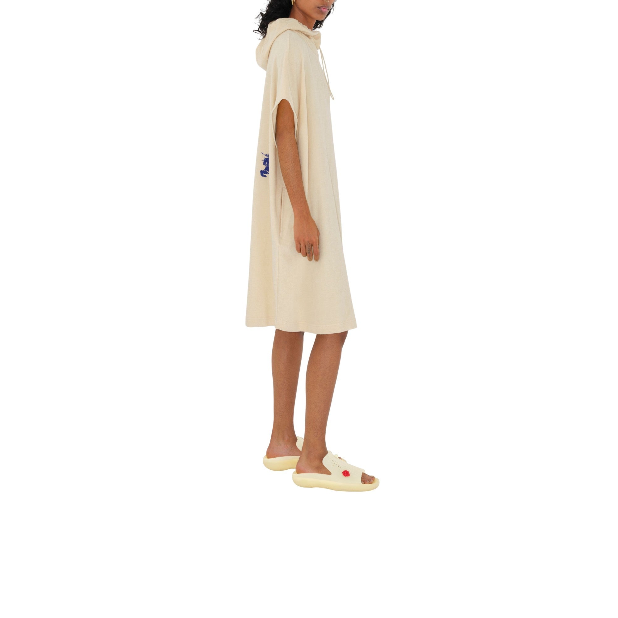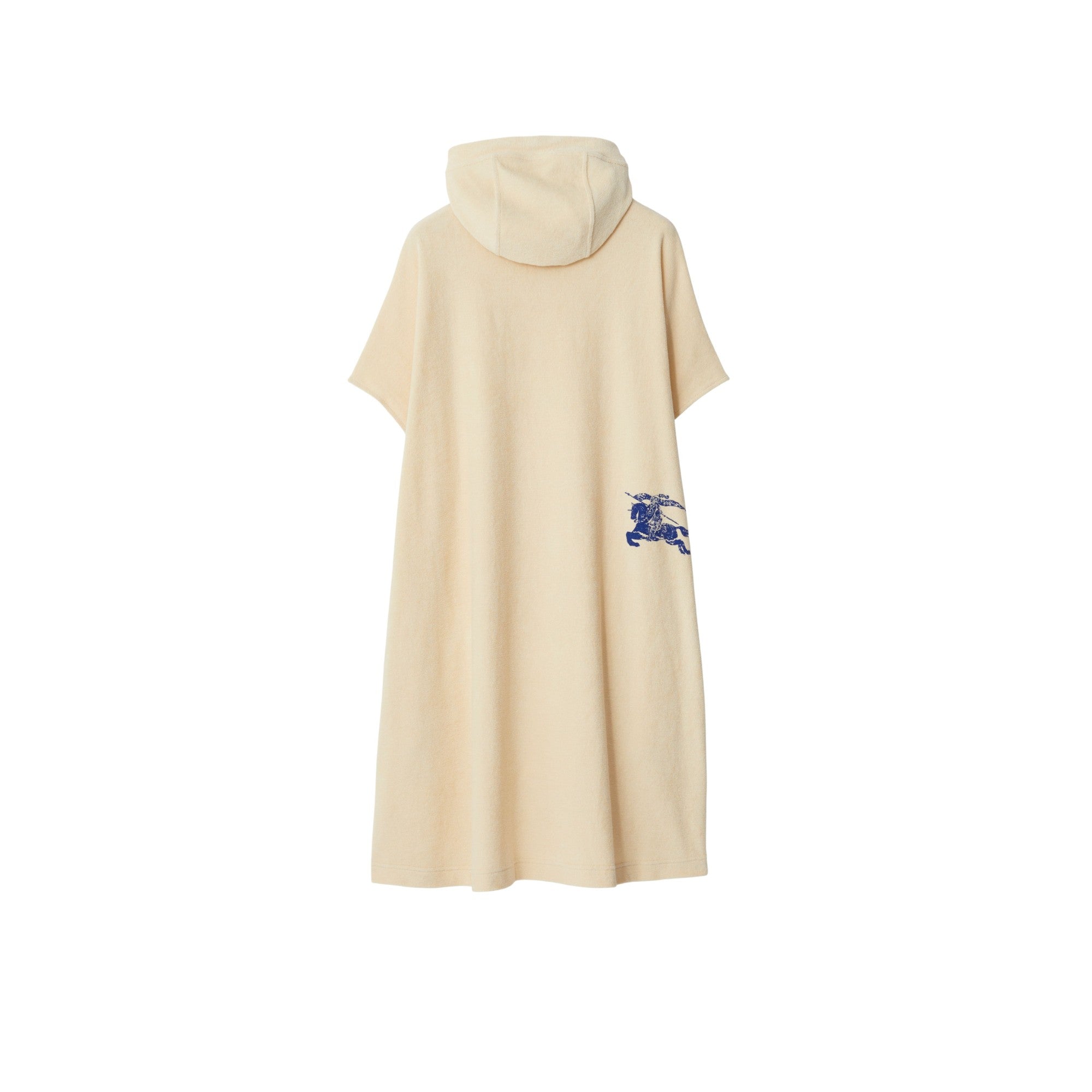 기마상 디자인(Equestrian Knight Design, EKD) 프린트가 연출된 면 타월링 소재의 민소매 드레스. 우비에서 영감을 받은 여유로운 핏의 경량 아이템이며, 조절 가능한 드로스트링 후드가 특징.##드로스트링 후드#측면의 슬립 포켓#뒷면의 기마상 디자인(Equestrian Knight Design, EKD) 프린트