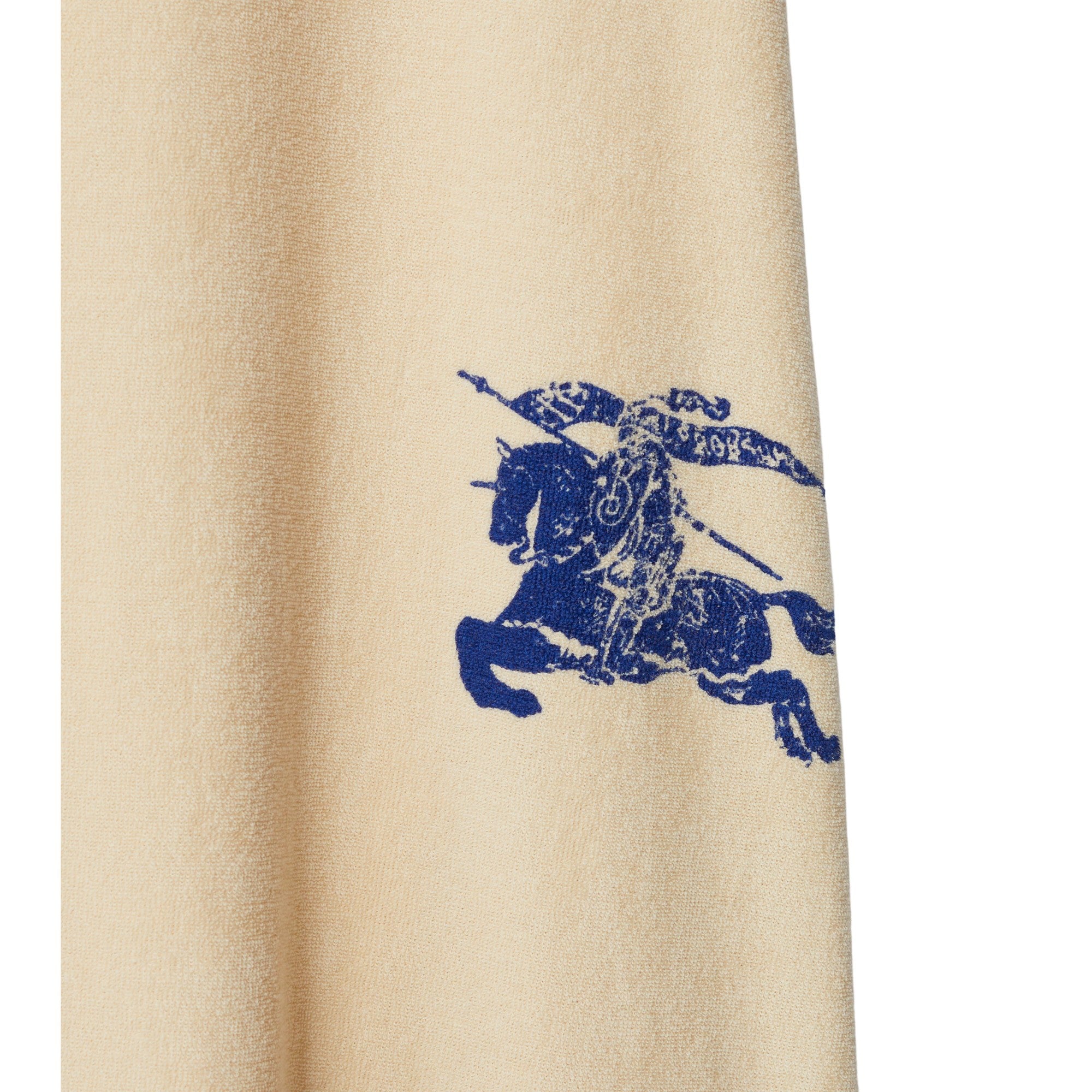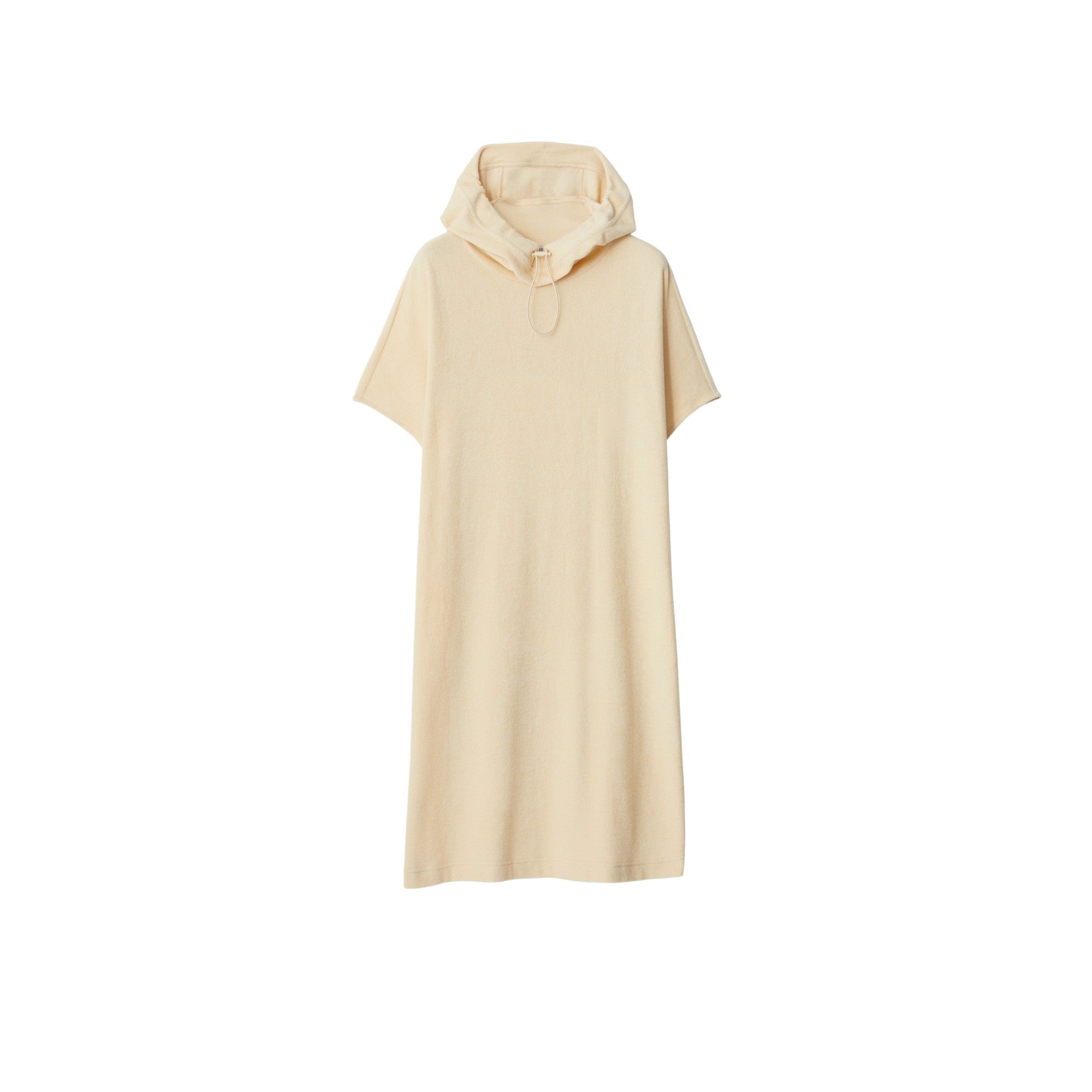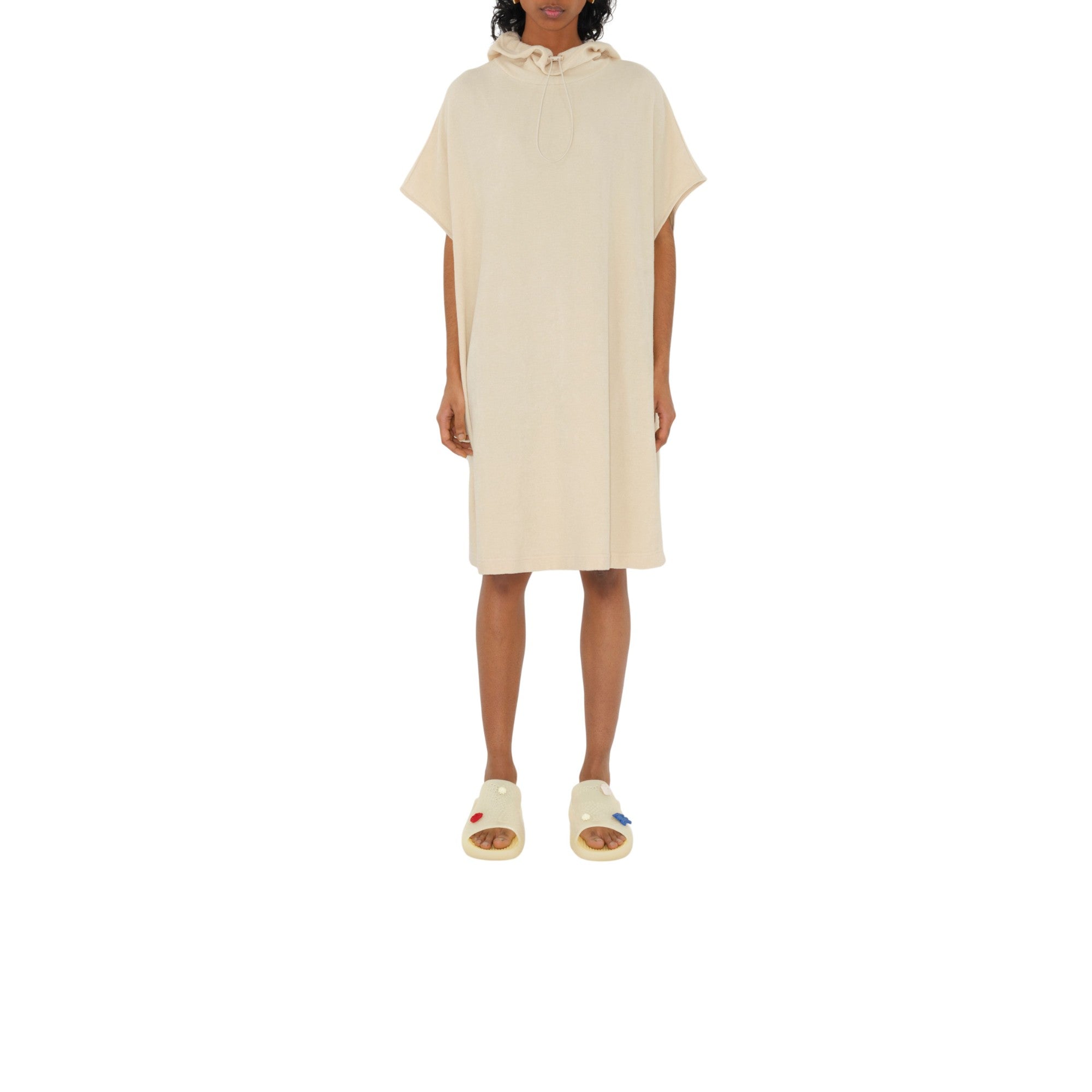 기마상 디자인(Equestrian Knight Design, EKD) 프린트가 연출된 면 타월링 소재의 민소매 드레스. 우비에서 영감을 받은 여유로운 핏의 경량 아이템이며, 조절 가능한 드로스트링 후드가 특징.##드로스트링 후드#측면의 슬립 포켓#뒷면의 기마상 디자인(Equestrian Knight Design, EKD) 프린트