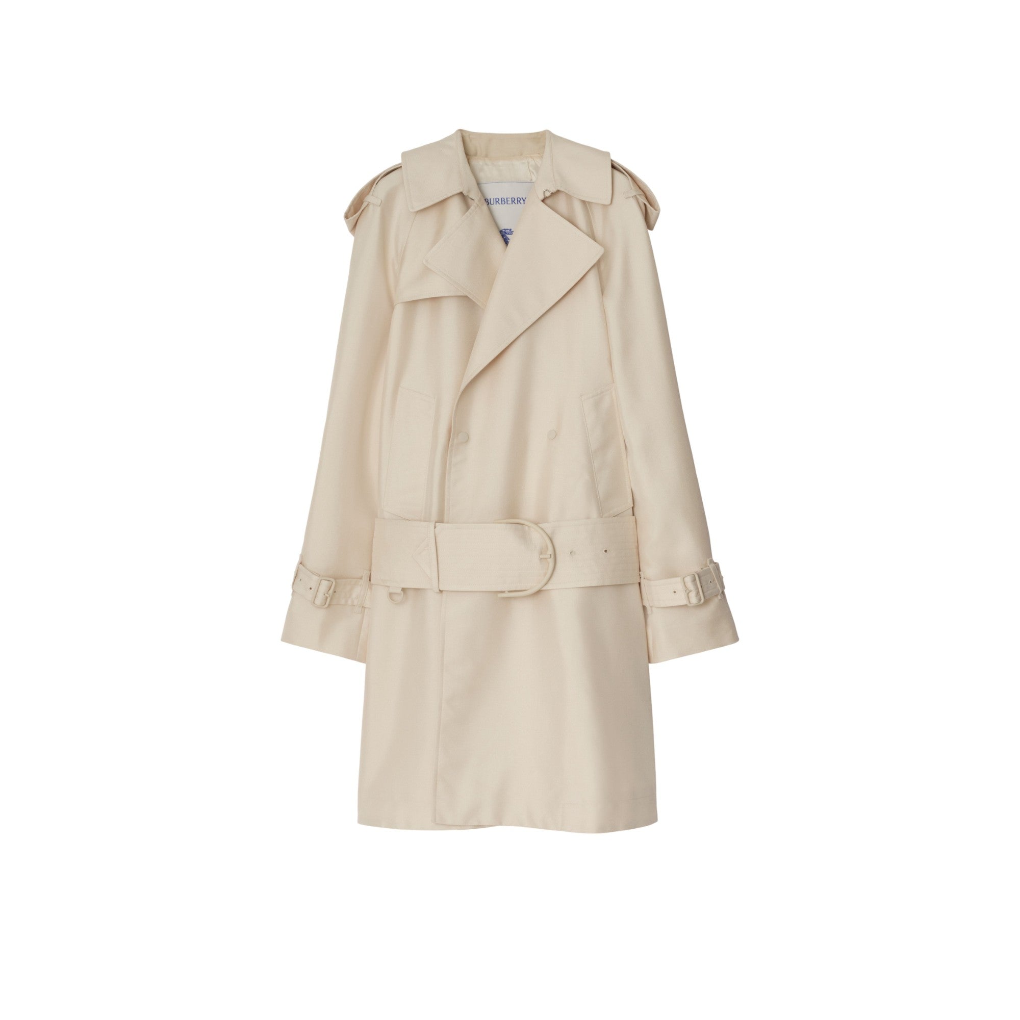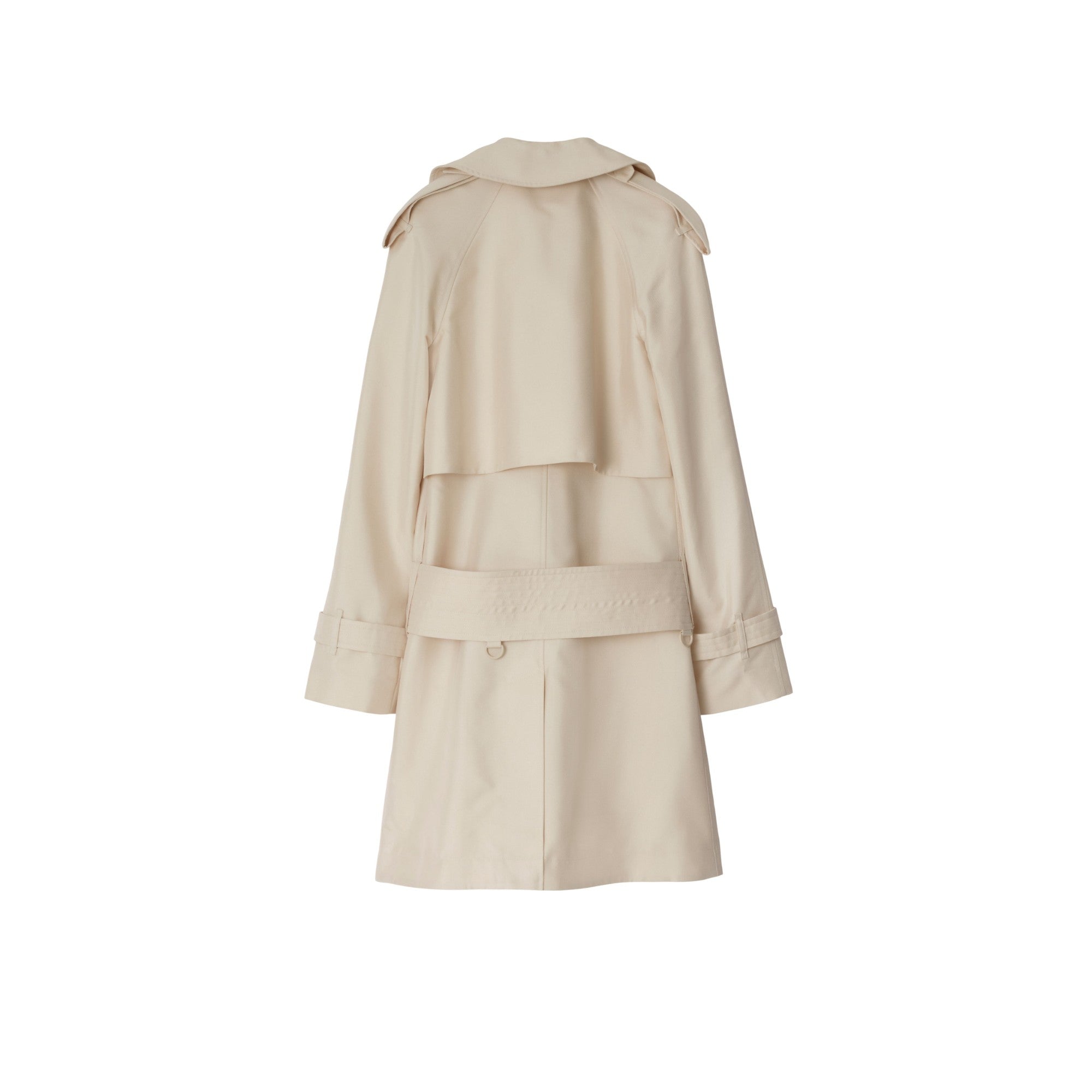 이탈리아에서 직조된 실크 혼방 소재의 경량 슬림핏 트렌치코트. 래글런 소매 및 과장된 견장이 돋보이며, 와이드한 디자인의 D링 버클 벨트를 사용해 미드 또는 로우 웨이스트의 두 가지 스타일로 착용할 수 있습니다.##더블브레스트 스냅 단추 여밈#후크 앤 아이 칼라 여밈#스롯래치#견장​#측면의 웰트 포켓​#커프스의 벨트 디테일​#뒤트임