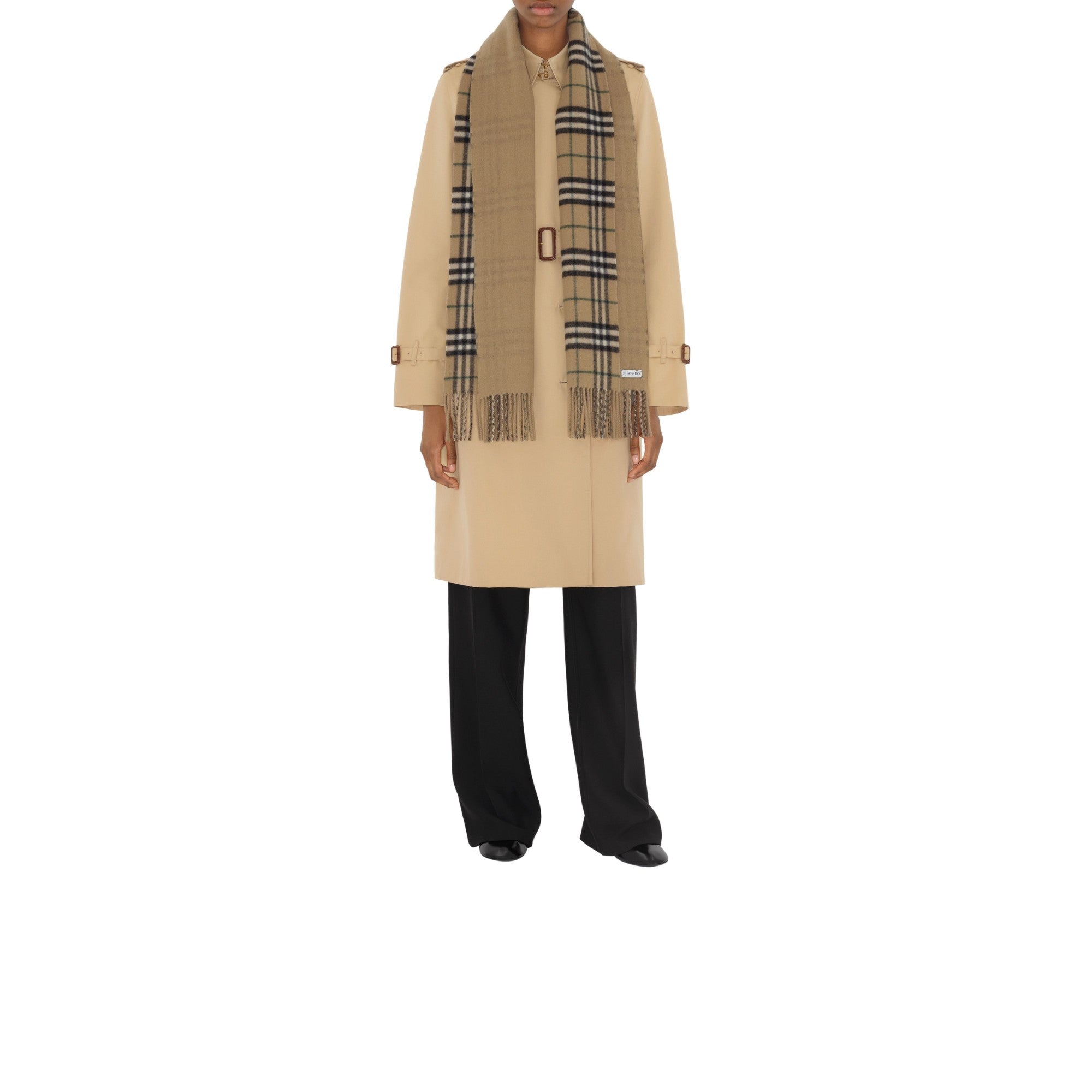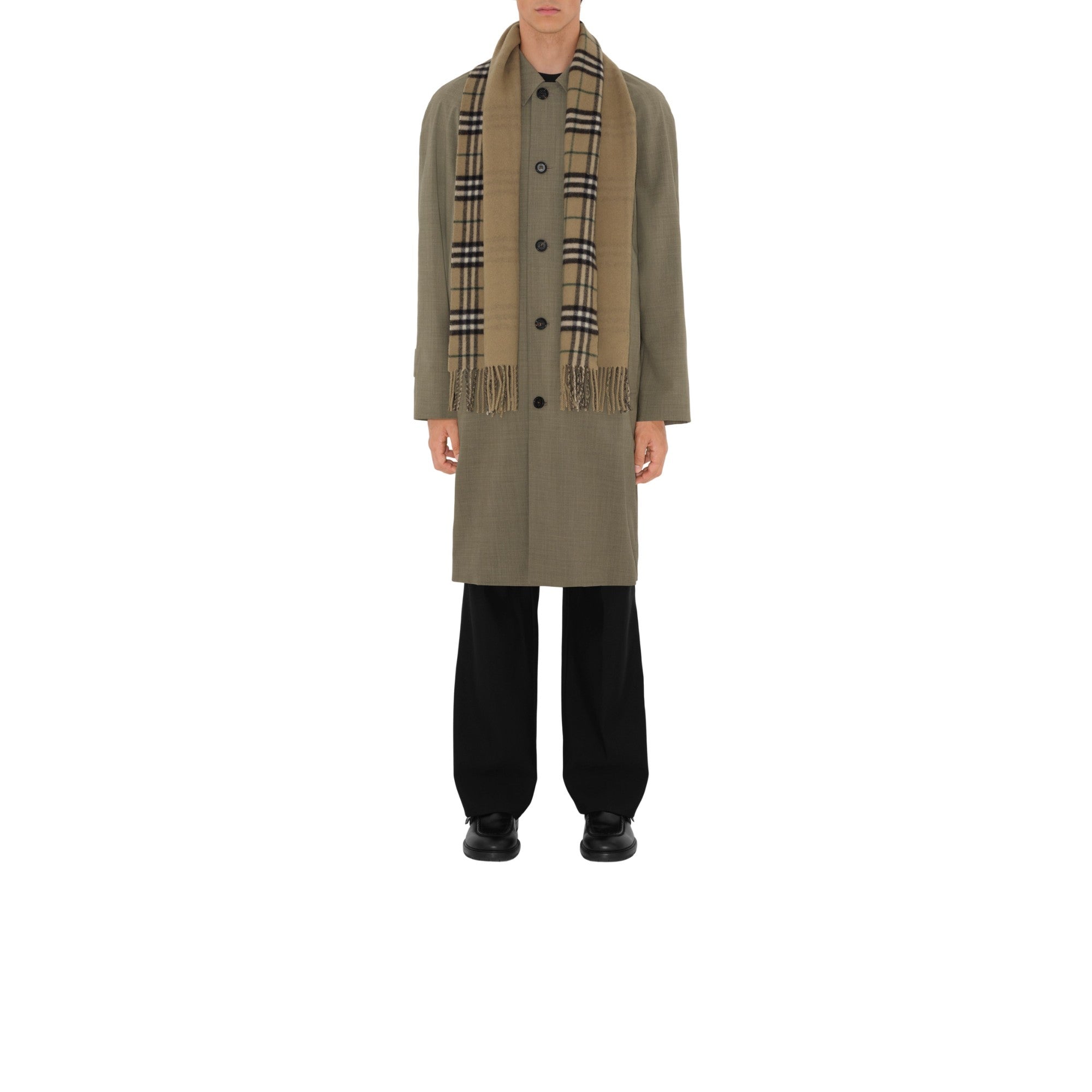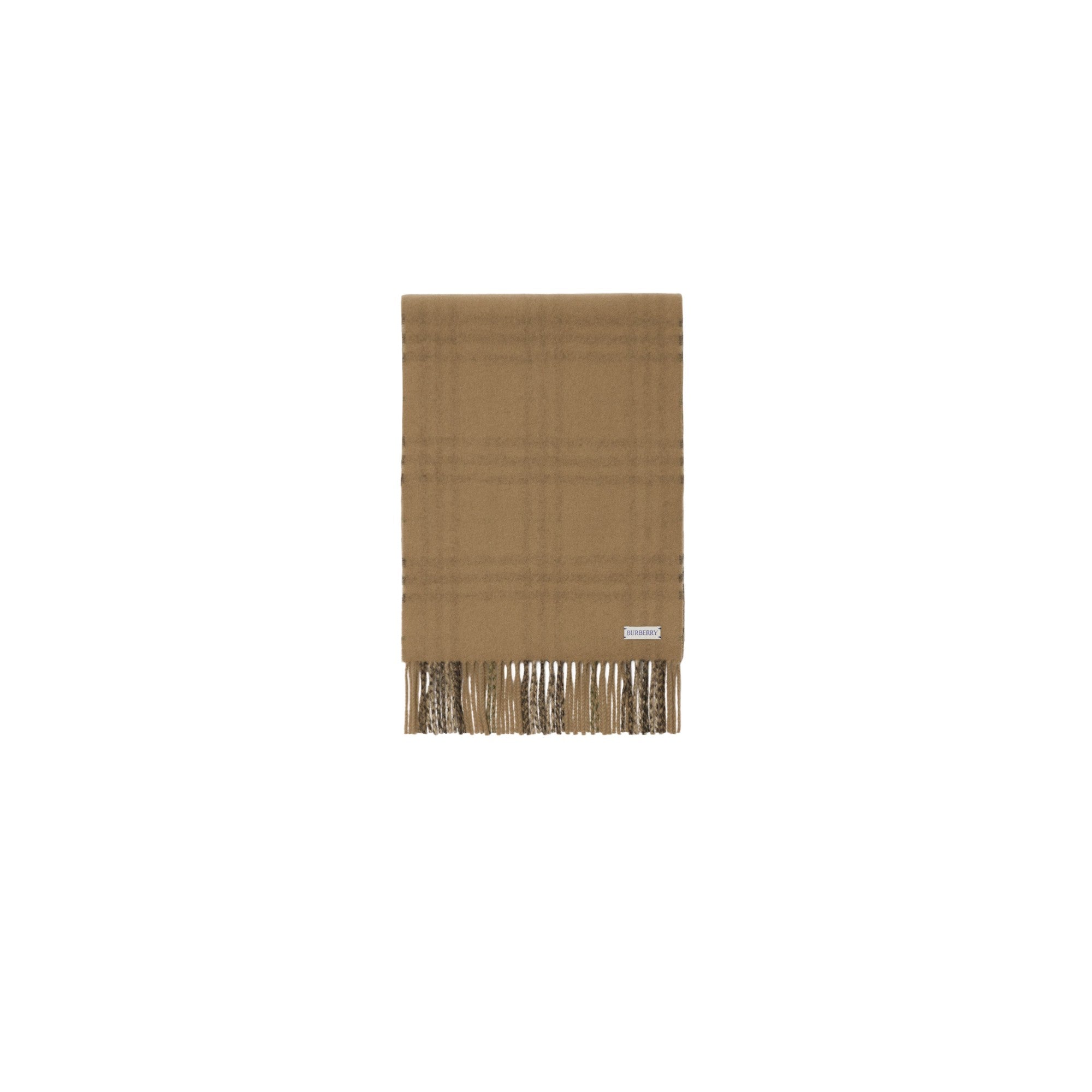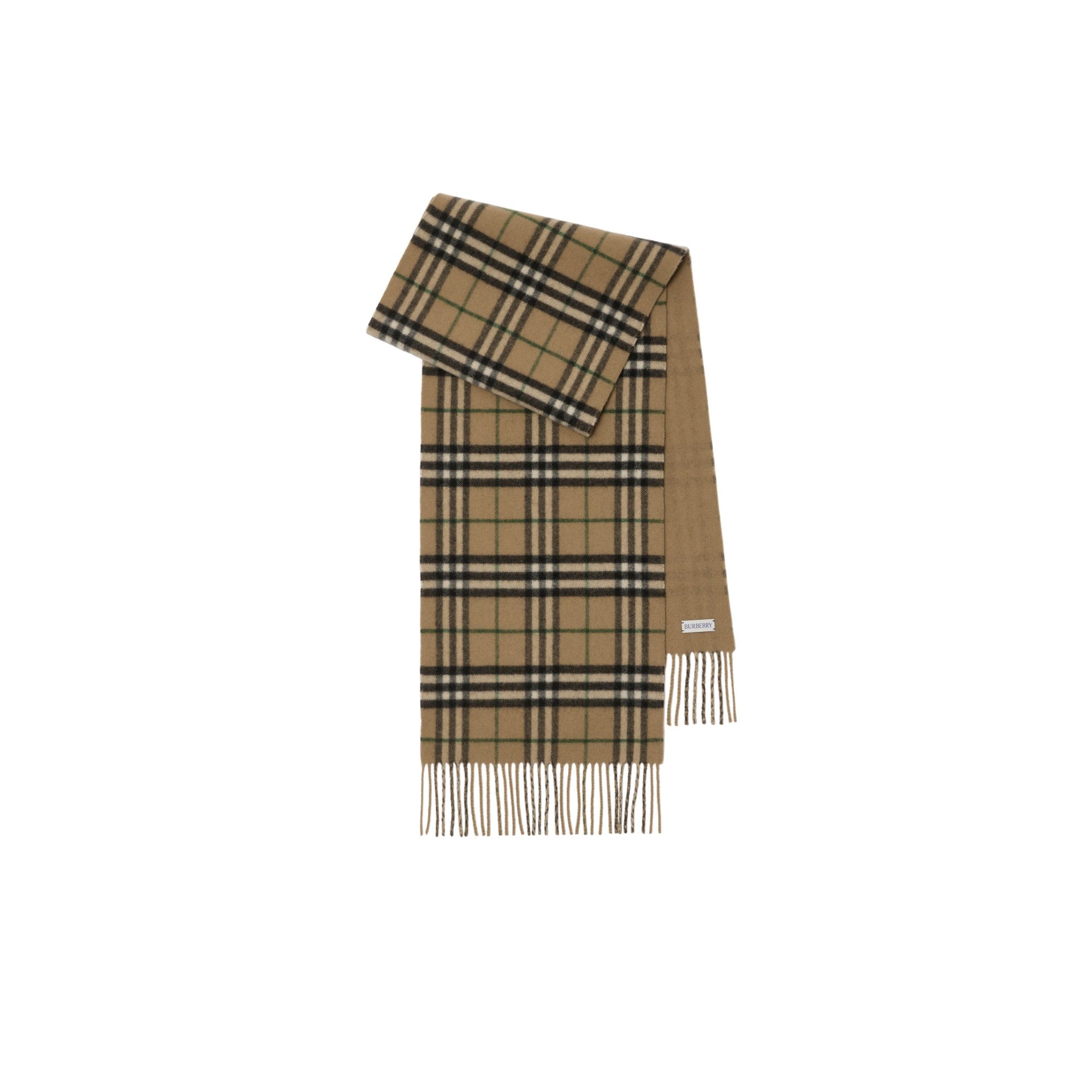 스코틀랜드 교외에 위치한 200년 역사의 직물 공장에서 직조된 캐시미어 소재의 스카프. 버버리 체크가 돋보이는 한쪽 면과 단색의 반대면으로 구성된 양면 아이템. 현지의 천연수로 세척된 후 두 차례 추가 워싱 처리를 거쳐 완성된 매우 부드러운 촉감과 기모 마감이 특징.##직사각형#양 가장자리의 프린지 디테일